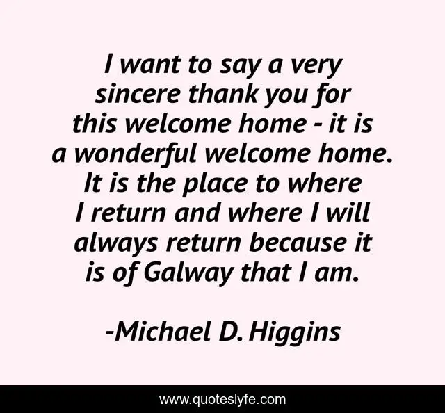 This page presents the quote "I want to say a very sincere thank you for this welcome home - it is a wonderful welcome home. It is the place to where I return and where I will always return because it is of Galway that I am.". Author of this quote is Michael D. Higgins. This quote is about thank you, welcome,.