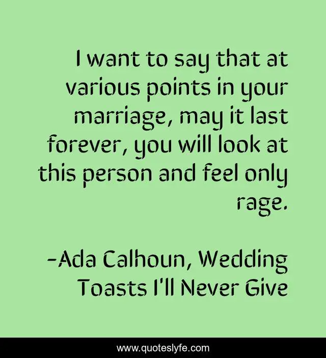 This page presents the quote "I want to say that at various points in your marriage, may it last forever, you will look at this person and feel only rage.". Author of this quote is Ada Calhoun, Wedding Toasts I'll Never Give. This quote is about marriage, rage,.