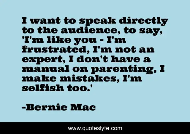 This page presents the quote "I want to speak directly to the audience, to say, 'I'm like you - I'm frustrated, I'm not an expert, I don't have a manual on parenting, I make mistakes, I'm selfish too.'". Author of this quote is Bernie Mac. This quote is about selfish, mistakes, speak,.