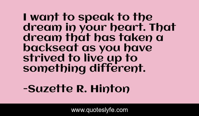 This page presents the quote "I want to speak to the dream in your heart. That dream that has taken a backseat as you have strived to live up to something different.". Author of this quote is Suzette R. Hinton. This quote is about inspirational-life, dream,.