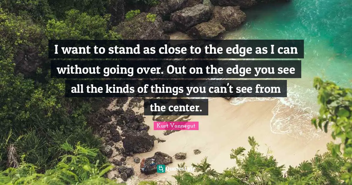 This page presents the quote "I want to stand as close to the edge as I can without going over. Out on the edge you see all the kinds of things you can't see from the center.". Author of this quote is Kurt Vonnegut. This quote is about i can, kind, standing on the edge,.