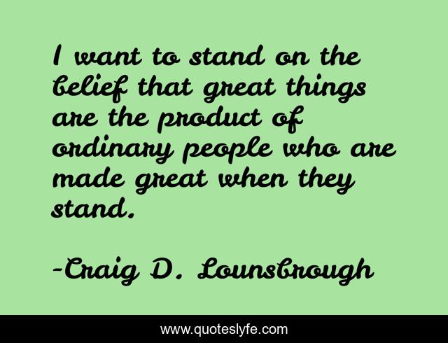 This page presents the quote "I want to stand on the belief that great things are the product of ordinary people who are made great when they stand.". Author of this quote is Craig D. Lounsbrough. This quote is about greatness, taking-a-stand, convictions, commitment, tenacity,.