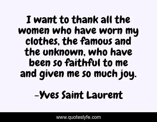 This page presents the quote "I want to thank all the women who have worn my clothes, the famous and the unknown, who have been so faithful to me and given me so much joy.". Author of this quote is Yves Saint Laurent. This quote is about me, joy, women,.