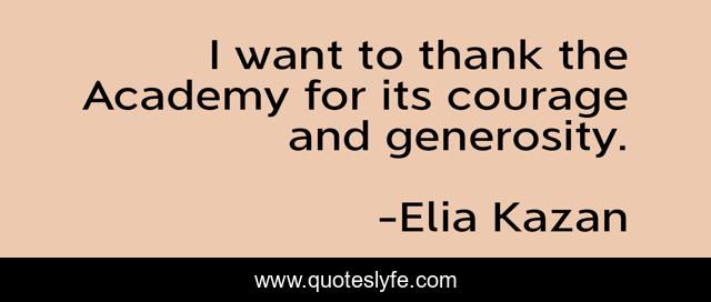 This page presents the quote "I want to thank the Academy for its courage and generosity.". Author of this quote is Elia Kazan. This quote is about generosity, academy,.