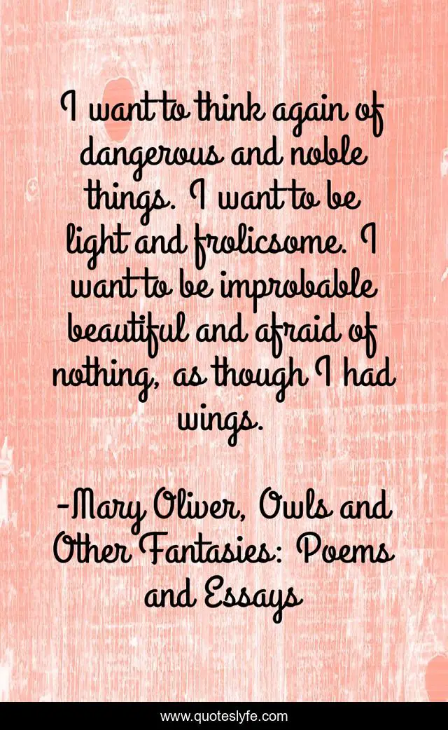 This page presents the quote "I want to think again of dangerous and noble things. I want to be light and frolicsome. I want to be improbable beautiful and afraid of nothing, as though I had wings.". Author of this quote is Mary Oliver, Owls and Other Fantasies: Poems and Essays. .
