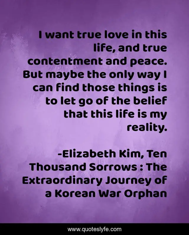 This page presents the quote "I want true love in this life, and true contentment and peace. But maybe the only way I can find those things is to let go of the belief that this life is my reality.". Author of this quote is Elizabeth Kim, Ten Thousand Sorrows : The Extraordinary Journey of a Korean War Orphan. This quote is about letting-go, acceptance-self-love, peace,.
