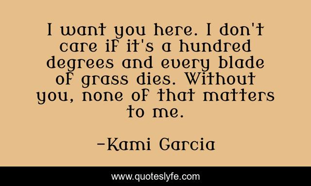 This page presents the quote "I want you here. I don't care if it's a hundred degrees and every blade of grass dies. Without you, none of that matters to me.". Author of this quote is Kami Garcia. This quote is about beautiful, death, love, chaos, apocalypse, affection,.