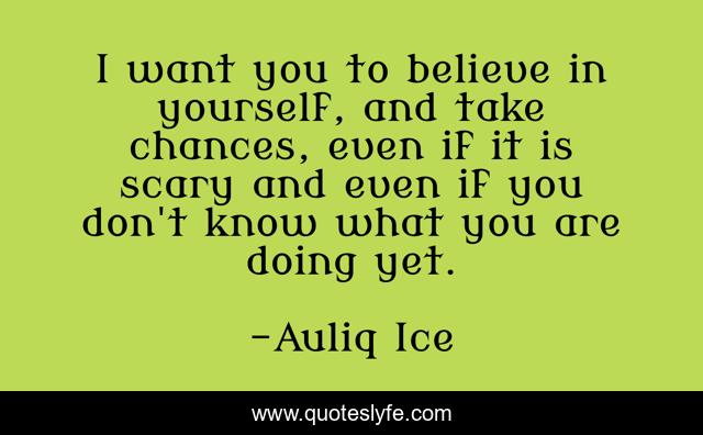 This page presents the quote "I want you to believe in yourself, and take chances, even if it is scary and even if you don't know what you are doing yet.". Author of this quote is Auliq Ice. This quote is about confidence, positive, motivational, courage, goals, inspirational, self-motivation, enthusiasm, goal-setting,.