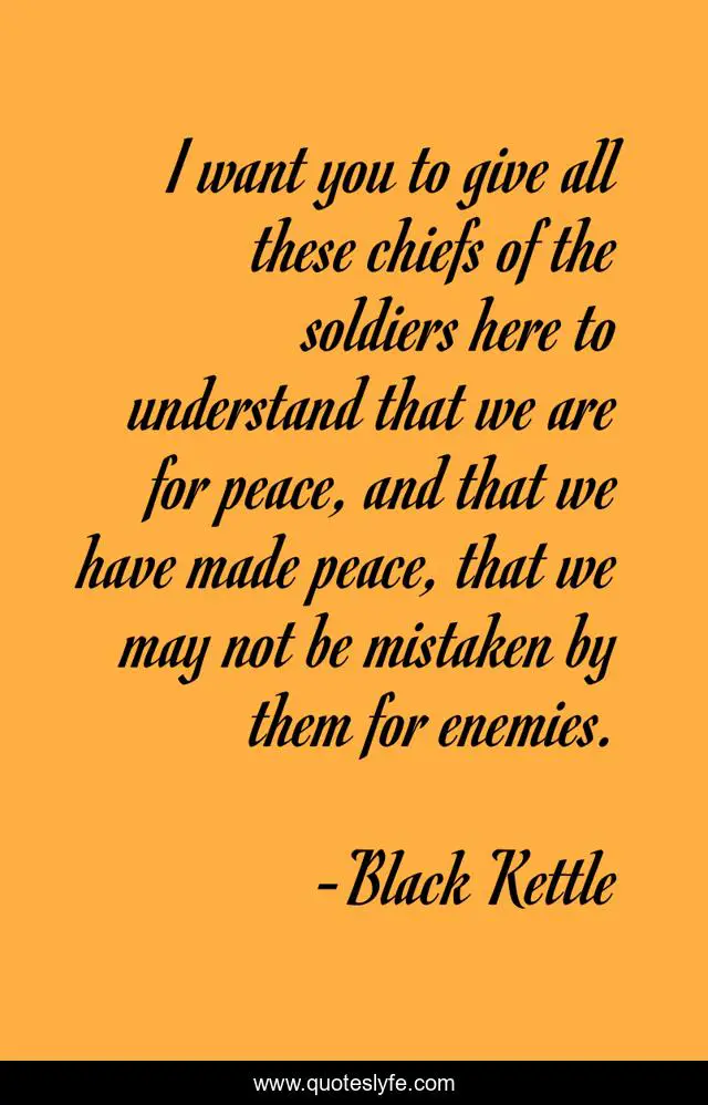 This page presents the quote "I want you to give all these chiefs of the soldiers here to understand that we are for peace, and that we have made peace, that we may not be mistaken by them for enemies.". Author of this quote is Black Kettle. .