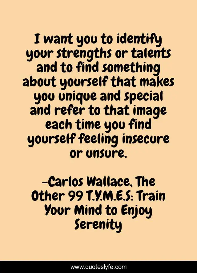 This page presents the quote "I want you to identify your strengths or talents and to find something about yourself that makes you unique and special and refer to that image each time you find yourself feeling insecure or unsure.". Author of this quote is Carlos Wallace, The Other 99 T.Y.M.E.S: Train Your Mind to Enjoy Serenity. This quote is about secure-people, strength-and-courage, talents, strength-of-character, strength-through-adversity,.