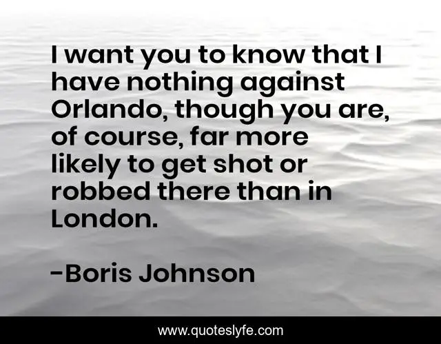 This page presents the quote "I want you to know that I have nothing against Orlando, though you are, of course, far more likely to get shot or robbed there than in London.". Author of this quote is Boris Johnson. This quote is about london, britain, orlando, united-states, crime,.