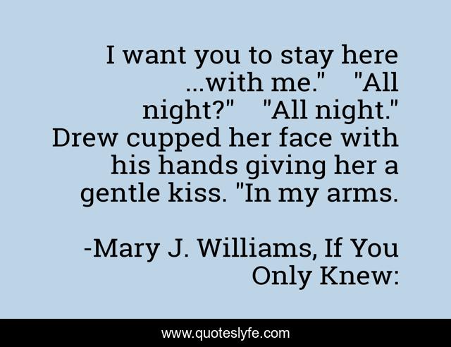This page presents the quote "I want you to stay here ...with me." "All night?" "All night." Drew cupped her face with his hands giving her a gentle kiss. "In my arms.". Author of this quote is Mary J. Williams, If You Only Knew:. This quote is about small-town-romance, contemporary-romance,.
