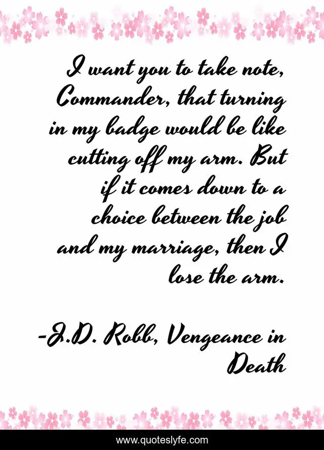 This page presents the quote "I want you to take note, Commander, that turning in my badge would be like cutting off my arm. But if it comes down to a choice between the job and my marriage, then I lose the arm.". Author of this quote is J.D. Robb, Vengeance in Death. .