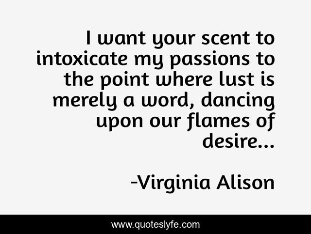 This page presents the quote "I want your scent to intoxicate my passions to the point where lust is merely a word, dancing upon our flames of desire...". Author of this quote is Virginia Alison. This quote is about desire, flames, dancing, lust, scent, intoxicating,.