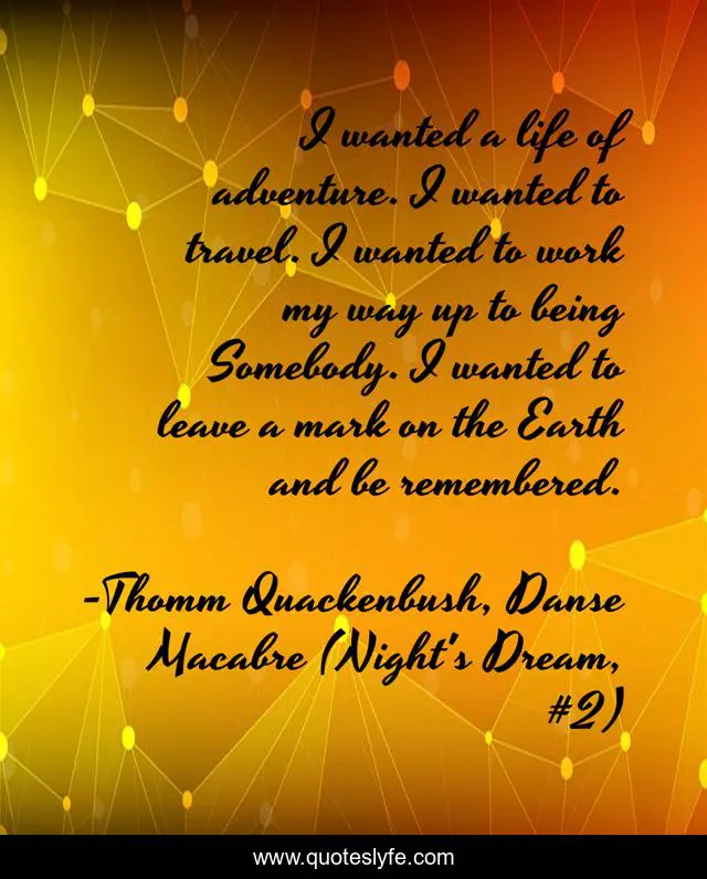 This page presents the quote "I wanted a life of adventure. I wanted to travel. I wanted to work my way up to being Somebody. I wanted to leave a mark on the Earth and be remembered.". Author of this quote is Thomm Quackenbush, Danse Macabre (Night's Dream, #2). This quote is about life, somebody, remembered, travel, adventure, memory,.