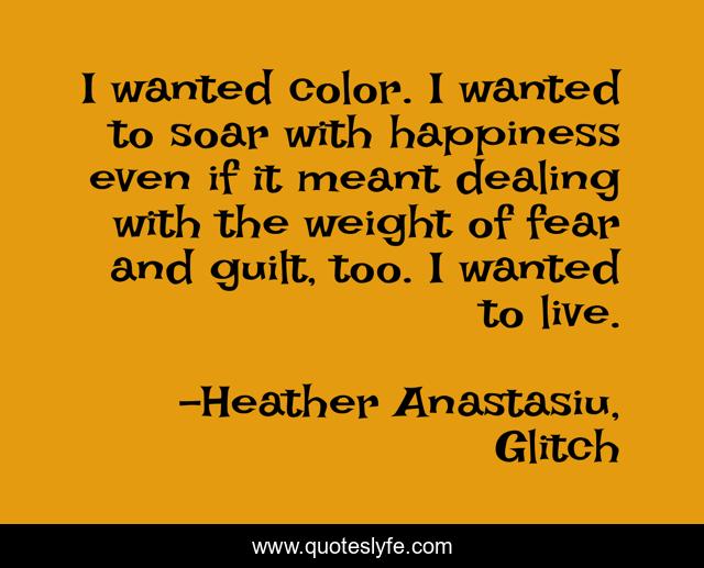 This page presents the quote "I wanted color. I wanted to soar with happiness even if it meant dealing with the weight of fear and guilt, too. I wanted to live.". Author of this quote is Heather Anastasiu, Glitch. This quote is about living, life, positive, positivity, confidence, optimism, optimistic, happiness, happy,.