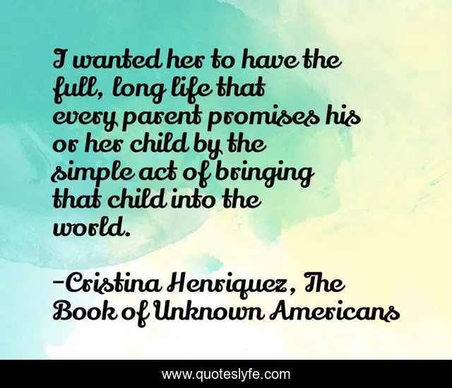 This page presents the quote "I wanted her to have the full, long life that every parent promises his or her child by the simple act of bringing that child into the world.". Author of this quote is Cristina Henriquez, The Book of Unknown Americans. This quote is about parenting, children, family,.