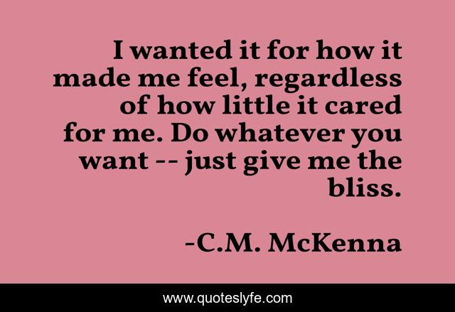 This page presents the quote "I wanted it for how it made me feel, regardless of how little it cared for me. Do whatever you want -- just give me the bliss.". Author of this quote is C.M. McKenna. This quote is about addiction, obsession,.