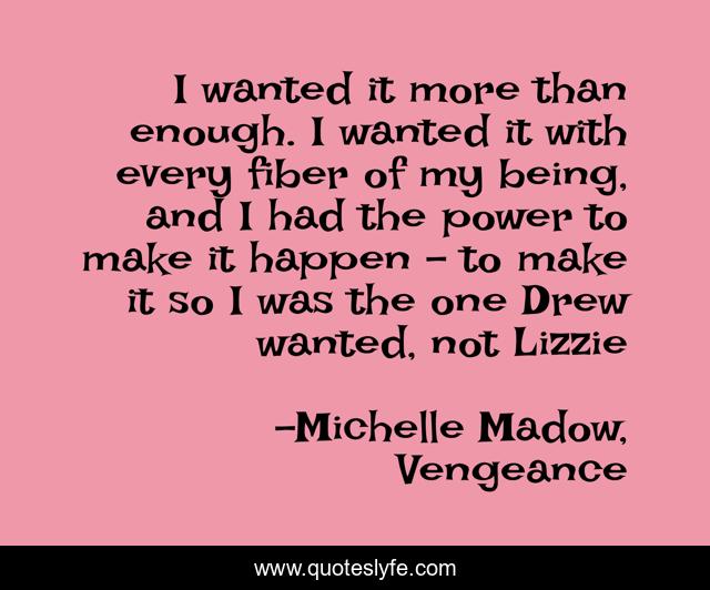 This page presents the quote "I wanted it more than enough. I wanted it with every fiber of my being, and I had the power to make it happen - to make it so I was the one Drew wanted, not Lizzie". Author of this quote is Michelle Madow, Vengeance. This quote is about chelsea-givens, vengeance, transcend-time, revenge,.