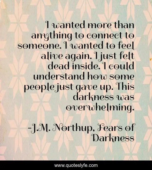 This page presents the quote "I wanted more than anything to connect to someone. I wanted to feel alive again. I just felt dead inside. I could understand how some people just gave up. This darkness was overwhelming.". Author of this quote is J.M. Northup, Fears of Darkness. This quote is about connect, hope, darkness,.