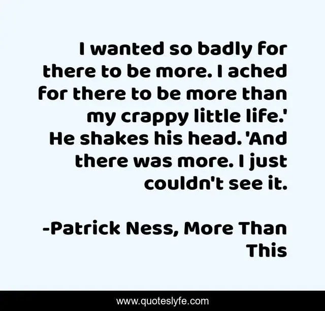 This page presents the quote "I wanted so badly for there to be more. I ached for there to be more than my crappy little life.' He shakes his head. 'And there was more. I just couldn't see it.". Author of this quote is Patrick Ness, More Than This. This quote is about life, suicide, more-than-this, beauty, ness, patrick-ness,.