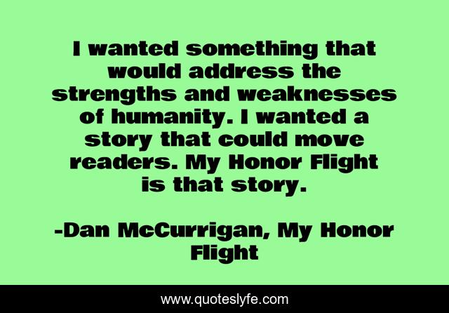 This page presents the quote "I wanted something that would address the strengths and weaknesses of humanity. I wanted a story that could move readers. My Honor Flight is that story.". Author of this quote is Dan McCurrigan, My Honor Flight. This quote is about world-war-ii, death, hero, courage, adventure, emotional, humanity,.