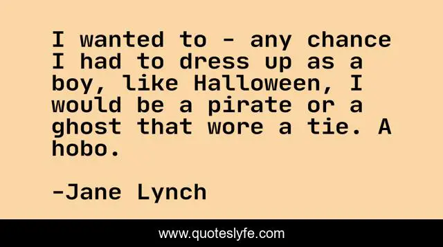 This page presents the quote "I wanted to - any chance I had to dress up as a boy, like Halloween, I would be a pirate or a ghost that wore a tie. A hobo.". Author of this quote is Jane Lynch. This quote is about ghost, halloween, dress,.