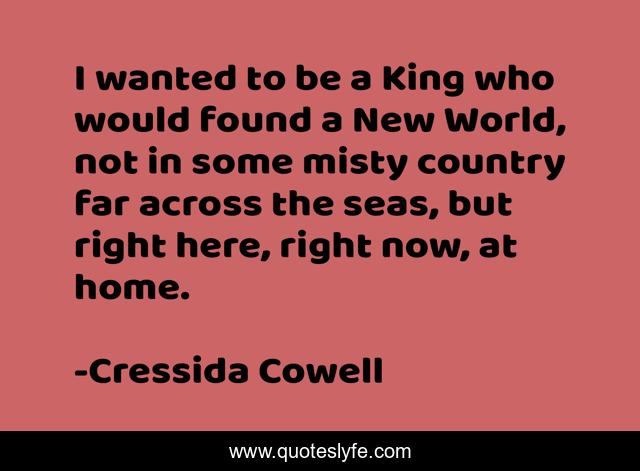 This page presents the quote "I wanted to be a King who would found a New World, not in some misty country far across the seas, but right here, right now, at home.". Author of this quote is Cressida Cowell. This quote is about home, hiccup, quest, travel, journey,.