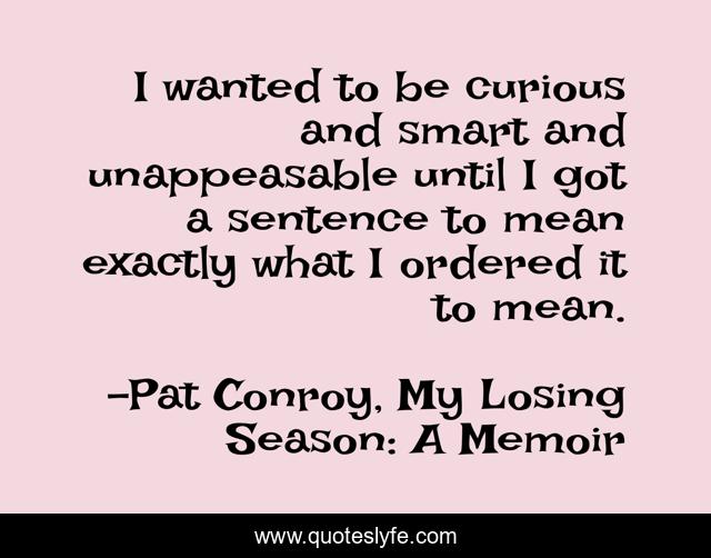 This page presents the quote "I wanted to be curious and smart and unappeasable until I got a sentence to mean exactly what I ordered it to mean.". Author of this quote is Pat Conroy, My Losing Season: A Memoir. This quote is about curiosity, writing,.
