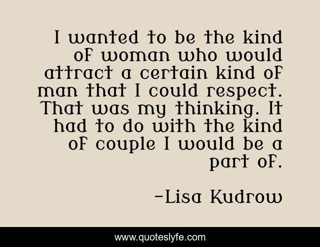 This page presents the quote "I wanted to be the kind of woman who would attract a certain kind of man that I could respect. That was my thinking. It had to do with the kind of couple I would be a part of.". Author of this quote is Lisa Kudrow. This quote is about thinking, woman, man,.