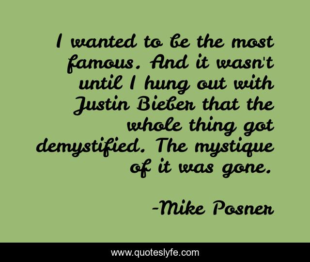 This page presents the quote "I wanted to be the most famous. And it wasn't until I hung out with Justin Bieber that the whole thing got demystified. The mystique of it was gone.". Author of this quote is Mike Posner. This quote is about gone, whole, got,.