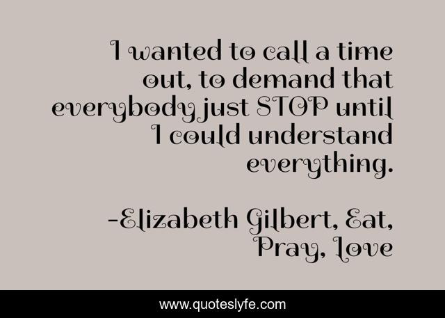 This page presents the quote "I wanted to call a time out, to demand that everybody just STOP until I could understand everything.". Author of this quote is Elizabeth Gilbert, Eat, Pray, Love. This quote is about slow-down, understanding,.
