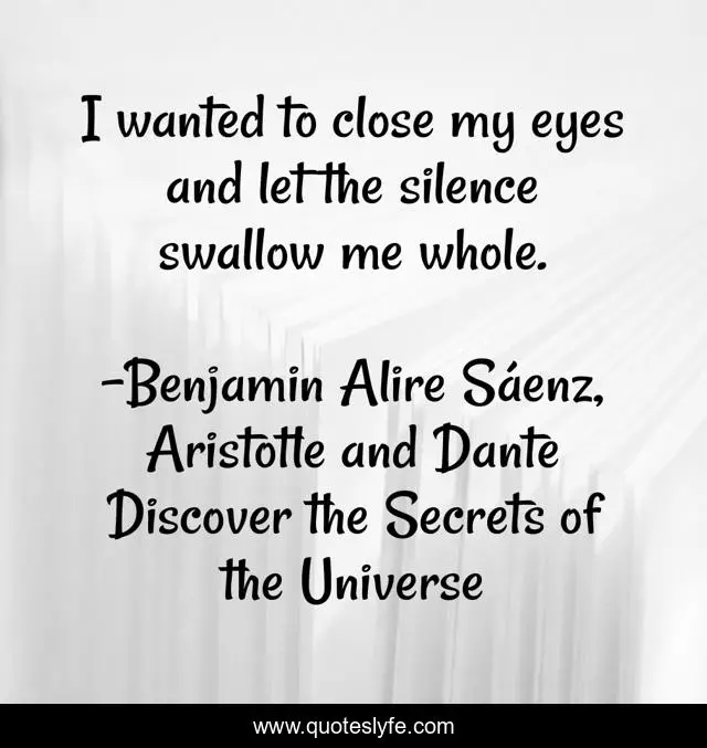 This page presents the quote "I wanted to close my eyes and let the silence swallow me whole.". Author of this quote is Benjamin Alire Sáenz, Aristotle and Dante Discover the Secrets of the Universe. This quote is about swallow, aristotle, silence, close-my-eyes,.