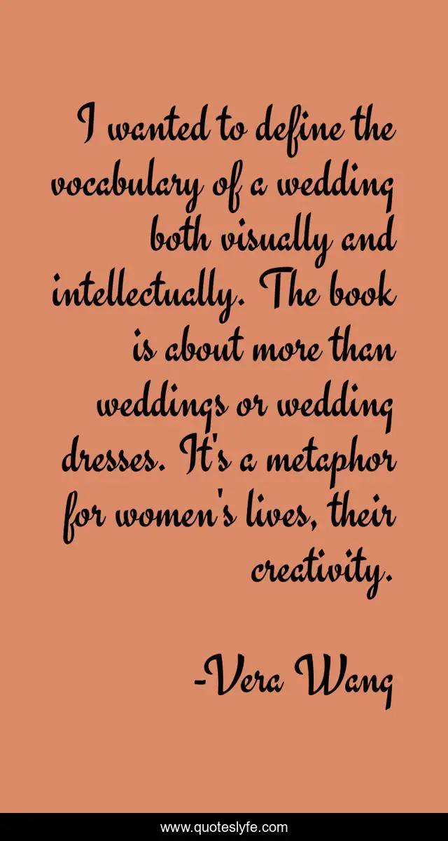 This page presents the quote "I wanted to define the vocabulary of a wedding both visually and intellectually. The book is about more than weddings or wedding dresses. It's a metaphor for women's lives, their creativity.". Author of this quote is Vera Wang. This quote is about book, creativity, women,.