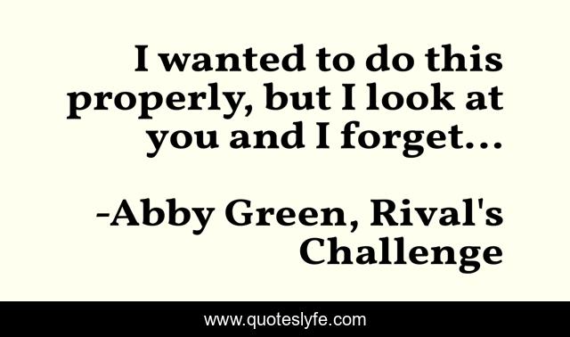This page presents the quote "I wanted to do this properly, but I look at you and I forget...". Author of this quote is Abby Green, Rival's Challenge. This quote is about romance, the-chatsfield-series, passion,.