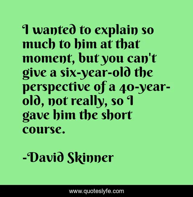 This page presents the quote "I wanted to explain so much to him at that moment, but you can't give a six-year-old the perspective of a 40-year-old, not really, so I gave him the short course.". Author of this quote is David Skinner. This quote is about parenthood, discipleship, mentoring,.