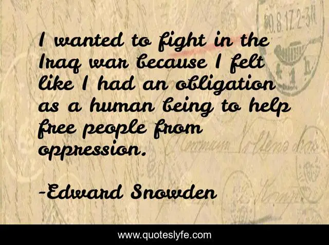 This page presents the quote "I wanted to fight in the Iraq war because I felt like I had an obligation as a human being to help free people from oppression.". Author of this quote is Edward Snowden. This quote is about fight, help, people,.