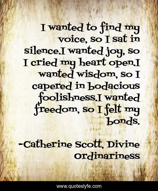 This page presents the quote "I wanted to find my voice, so I sat in silence.I wanted joy, so I cried my heart open.I wanted wisdom, so I capered in bodacious foolishness.I wanted freedom, so I felt my bonds.". Author of this quote is Catherine Scott, Divine Ordinariness. This quote is about humorous, spiritual-fun, travel,.