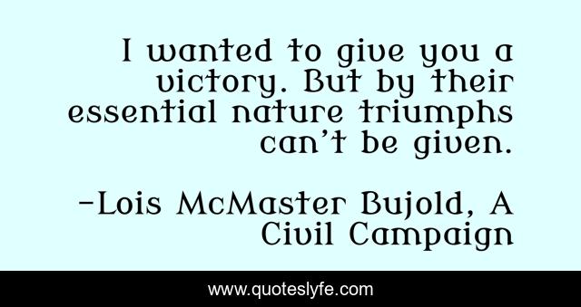 This page presents the quote "I wanted to give you a victory. But by their essential nature triumphs can’t be given.". Author of this quote is Lois McMaster Bujold, A Civil Campaign. This quote is about nature, giving, give, earn-it, triumphs, nature-of-things, victory, triumph,.