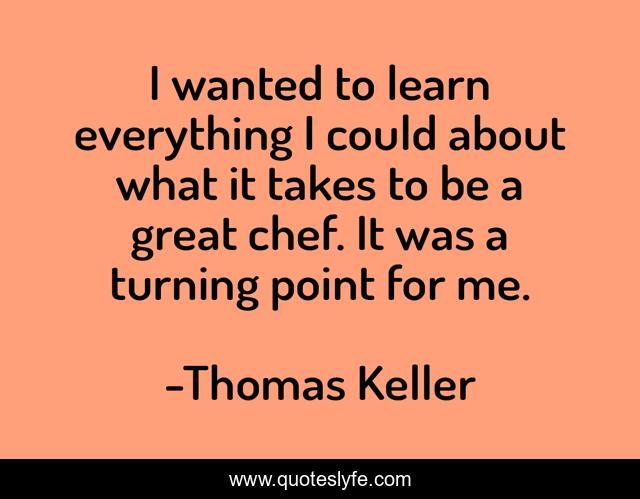 This page presents the quote "I wanted to learn everything I could about what it takes to be a great chef. It was a turning point for me.". Author of this quote is Thomas Keller. This quote is about chef, me, learn,.