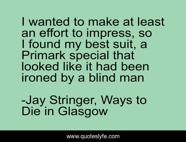 This page presents the quote "I wanted to make at least an effort to impress, so I found my best suit, a Primark special that looked like it had been ironed by a blind man". Author of this quote is Jay Stringer, Ways to Die in Glasgow. This quote is about sam-ireland, humour,.