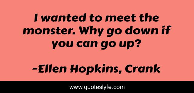 This page presents the quote "I wanted to meet the monster. Why go down if you can go up?". Author of this quote is Ellen Hopkins, Crank. This quote is about teen, life, substance, monster, drug, crank, drug-abuse, party, addiction,.