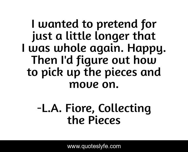 This page presents the quote "I wanted to pretend for just a little longer that I was whole again. Happy. Then I'd figure out how to pick up the pieces and move on.". Author of this quote is L.A. Fiore, Collecting the Pieces. This quote is about collecting-the-pieces, love, loss, heartbreak, healing, affection,.