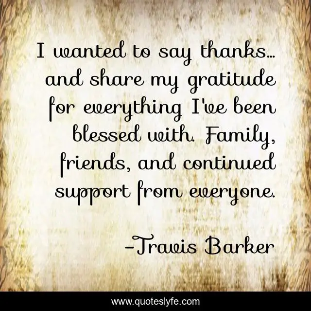 This page presents the quote "I wanted to say thanks... and share my gratitude for everything I've been blessed with. Family, friends, and continued support from everyone.". Author of this quote is Travis Barker. This quote is about gratitude, support, friends,.