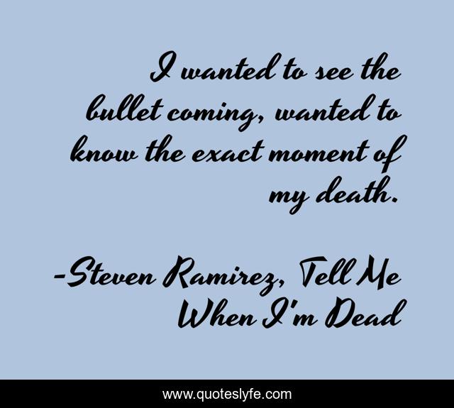This page presents the quote "I wanted to see the bullet coming, wanted to know the exact moment of my death.". Author of this quote is Steven Ramirez, Tell Me When I'm Dead. This quote is about drunk, novel, dead, zombie-thriller, soldiers, paranormal-thriller, horde, na, hordes,.
