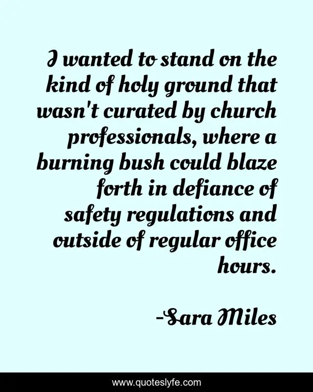 This page presents the quote "I wanted to stand on the kind of holy ground that wasn't curated by church professionals, where a burning bush could blaze forth in defiance of safety regulations and outside of regular office hours.". Author of this quote is Sara Miles. This quote is about faith, city-of-god, christianity, following-god,.