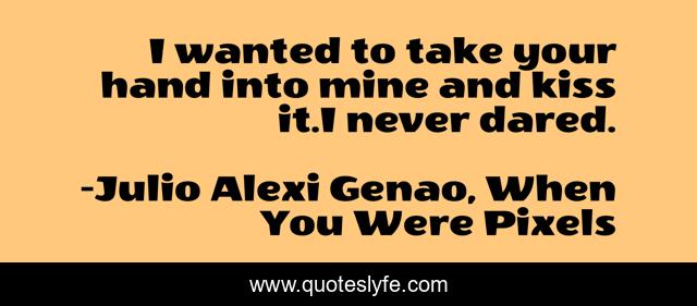 This page presents the quote "I wanted to take your hand into mine and kiss it.I never dared.". Author of this quote is Julio Alexi Genao, When You Were Pixels. .