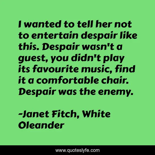 This page presents the quote "I wanted to tell her not to entertain despair like this. Despair wasn't a guest, you didn't play its favourite music, find it a comfortable chair. Despair was the enemy.". Author of this quote is Janet Fitch, White Oleander. This quote is about sadness, despair, depression,.