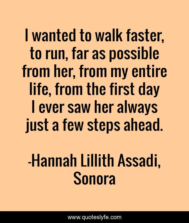 This page presents the quote "I wanted to walk faster, to run, far as possible from her, from my entire life, from the first day I ever saw her always just a few steps ahead.". Author of this quote is Hannah Lillith Assadi, Sonora. This quote is about relationships, hannah-lillith-assadi, run-away, escape, friendship, sonora,.