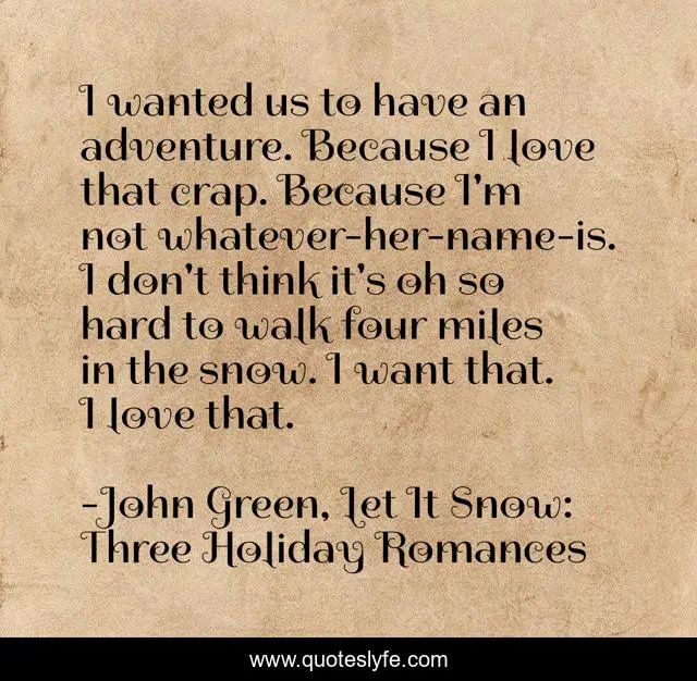 This page presents the quote "I wanted us to have an adventure. Because I love that crap. Because I'm not whatever-her-name-is. I don't think it's oh so hard to walk four miles in the snow. I want that. I love that.". Author of this quote is John Green, Let It Snow: Three Holiday Romances. This quote is about passion, love, adventure, affection, crap,.